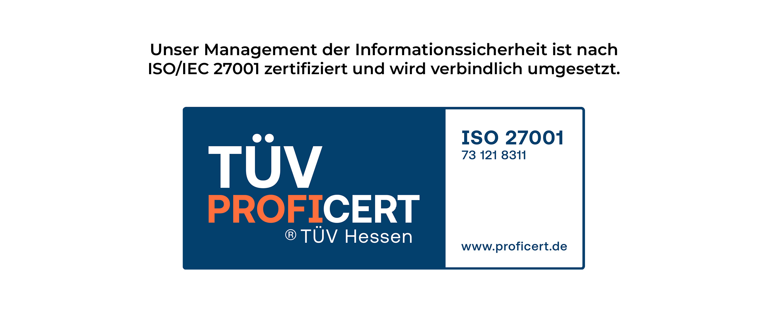 Für Ihre und unsere Sicherheit ist unser Unternehmen nach DIN ISO 27001 zertifiziert.